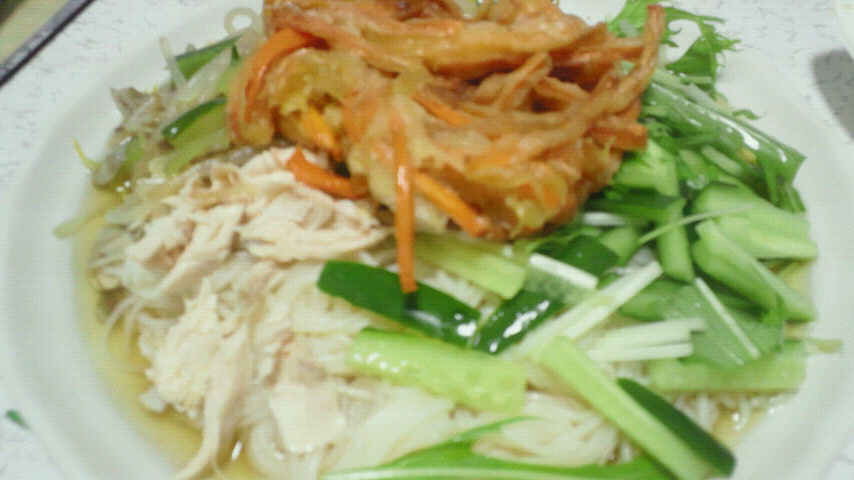 キュウリ、もやし、水菜、茹でた鶏のささみ、天かす
